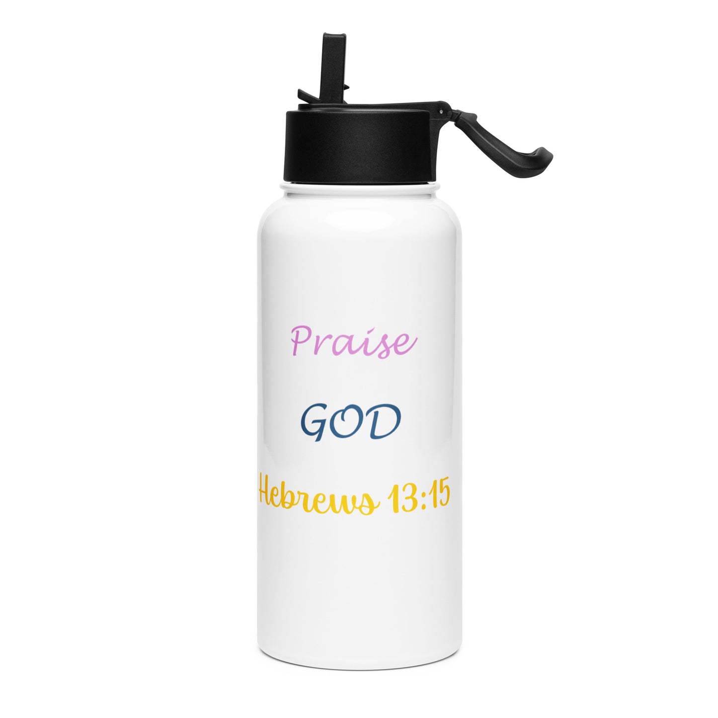PRAISE GOD Stainless steel water bottle with a straw lid with HEBREWS 13:5 scripture in COLOR letters with PRAYING HANDS
